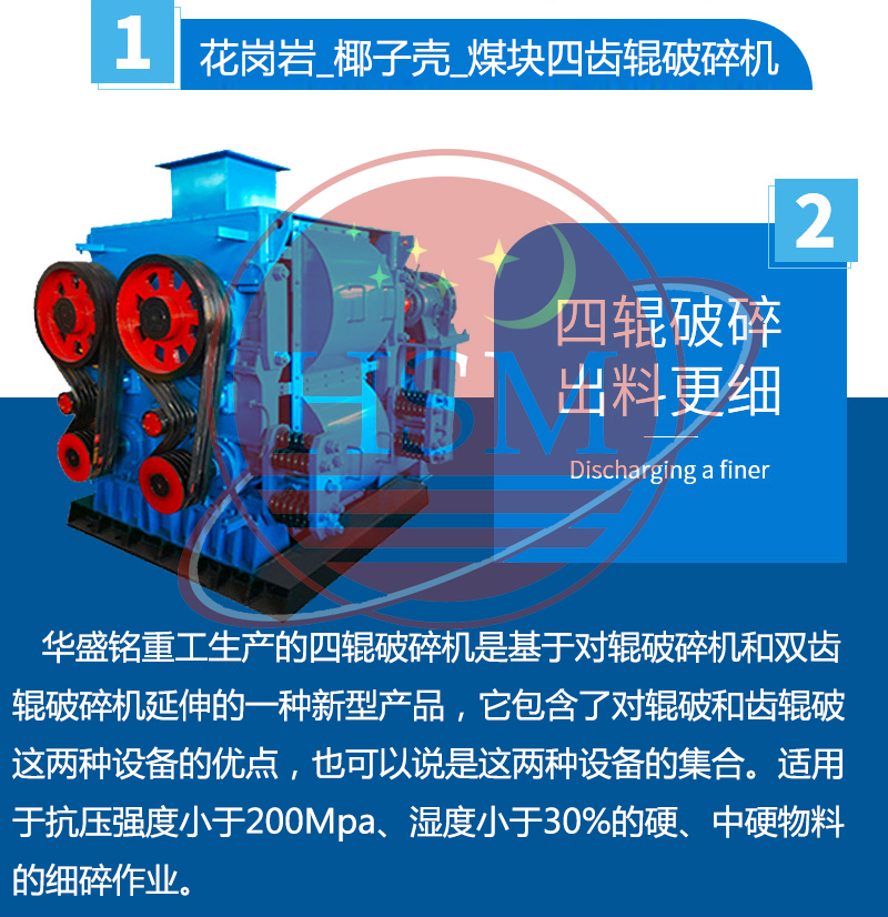 【应用范围】:四辊破碎机适用于抗压强度小于200Mpa、湿度小于30%的硬、中硬物料的细碎作业。如焦炭、煤、陶瓷原料、石英石、石灰石、长石、水渣、石膏、粘土、食盐、化工原料等固体物料。